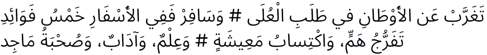 Merantaulah dari kampung halaman untuk menggapai kemuliaan, dan bepergianlah karena dalam bepergian terdapat lima manfaat. Menghilang gundah di hati, bisa mengais rejeki, menuntut ilmu, belajar etika, dan bertemu teman yang mulia.